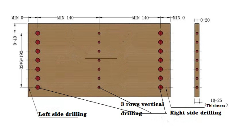 WDA032, narrow panel Drilling machine is used for wood industry and panel furniture industry drilling, have two groups (7/5pcs drills per group) side horizontal drills and three groups (7/5pcs drills per group) top vertical drills,horizontal drills and vertical drills can working alternate(Asynchronization)and together(Synchronization).